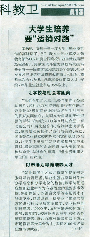 2010年5月6日,合肥晚报A13科教卫版对我院入选全国毕业生就业典型经验高校一事进行了报道。