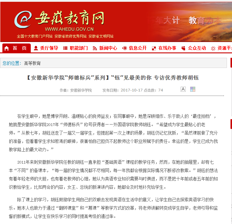 安徽教育网:【安徽新华学院“师德标兵”系列】“钰”见最美的你 专访优秀教师胡钰