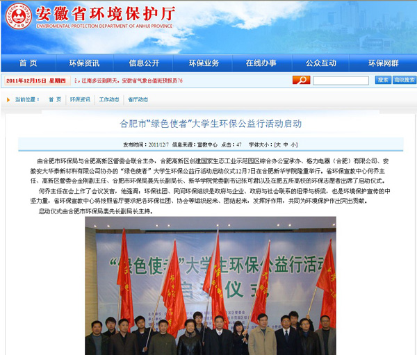 安徽省环保厅网站报道合肥市大学生环保公益行在我校启动