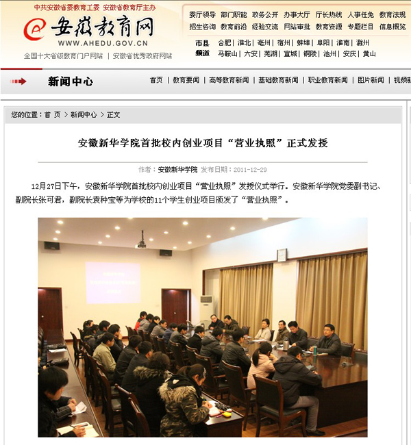 安徽教育网首页报道我校校内创业项目“营业执照”正式发授