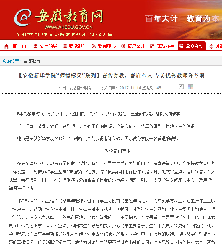 安徽教育网:【安徽新华学院“师德标兵”系列】言传身教,善启心灵 专访优秀教师许冬
