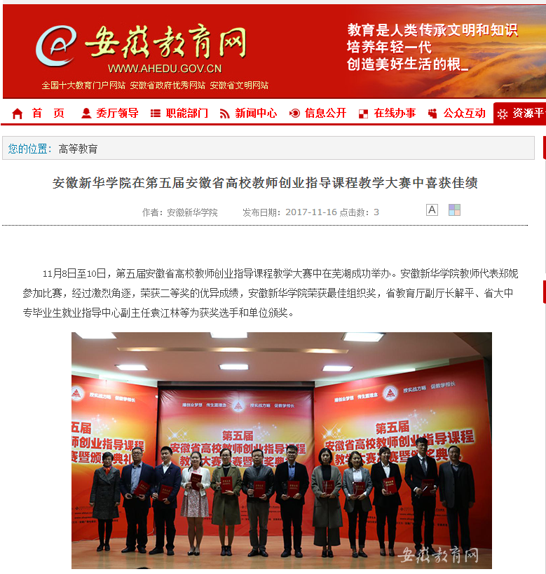 安徽教育网:安徽新华学院在第五届安徽省高校教师创业指导课程教学大赛中喜获佳绩