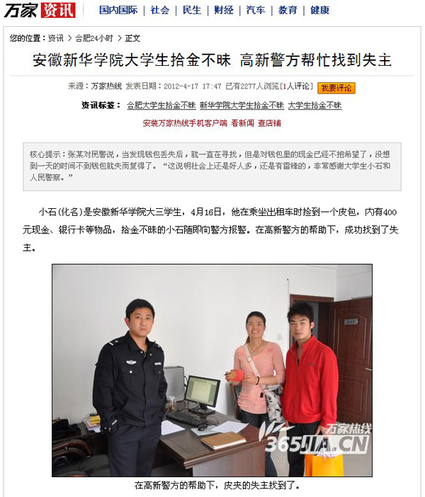 4月17日的万家咨询报道了我校大学生在乘坐出租车时捡到了一个钱包,在高新区警方的协助下,成功找到失主。