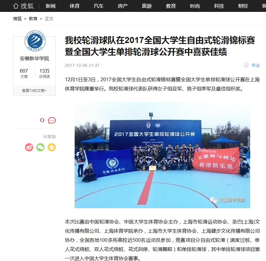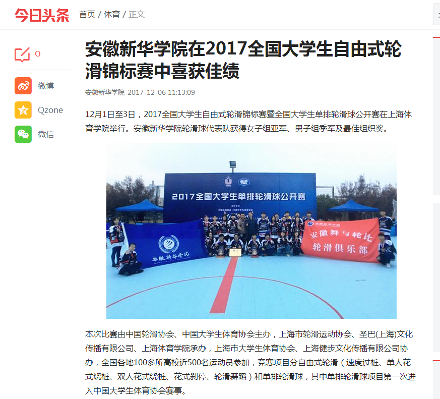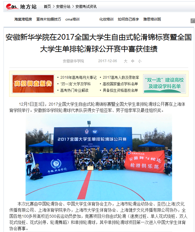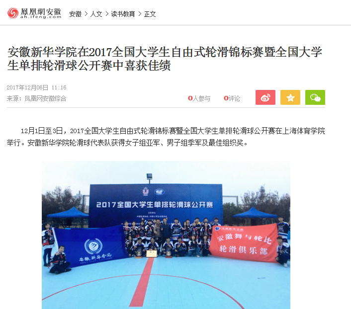 中国教育在线、凤凰网安徽、今日头条、搜狐网: 安徽新华学院在2017全国大学生自由式轮滑锦标赛暨全国大学生单排轮滑球公开赛中喜获佳绩