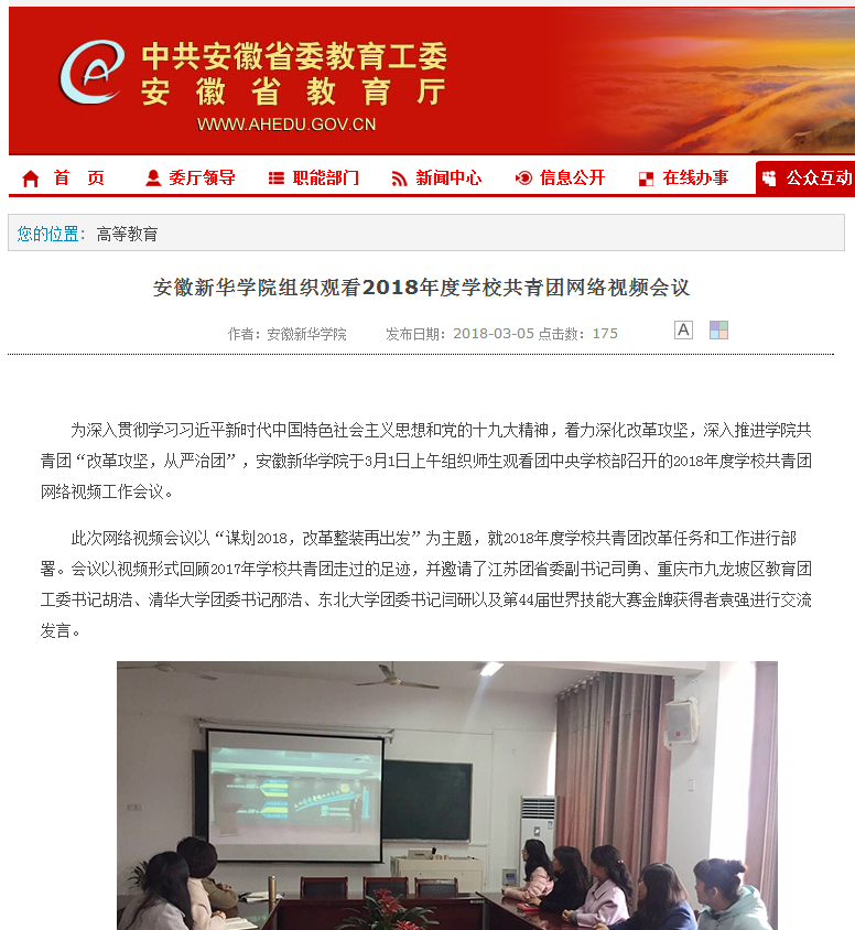 安徽教育网:安徽新华学院组织观看2018年度学校共青团网络视频会议
